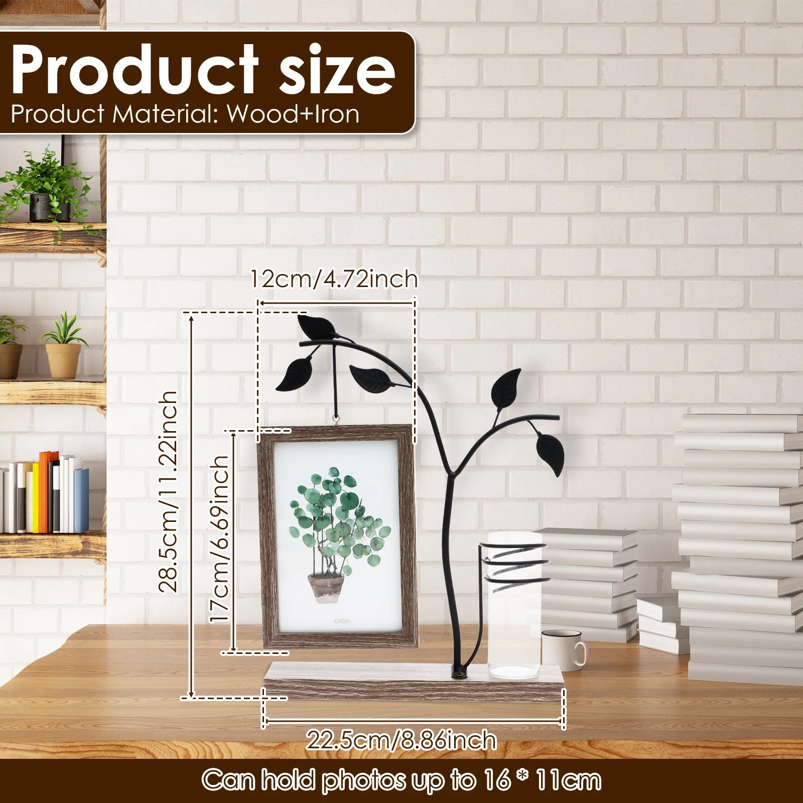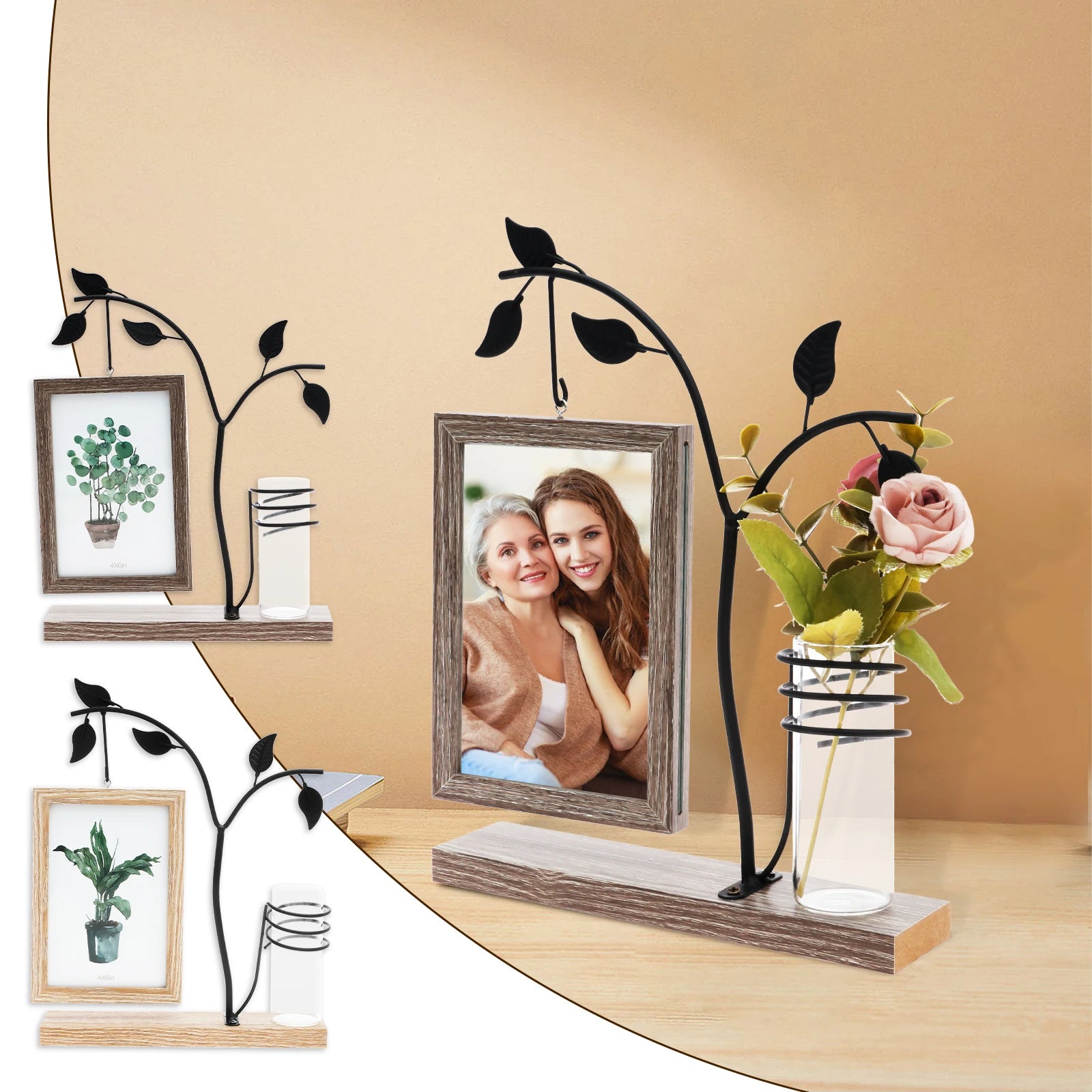 Materials:Made from wood and metal materials, this photo frame ensures reliability and stability. The transparent glass vase is not only aesthetically pleasing but also easy to clean